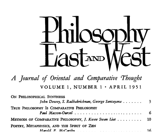 But Dewey’s time was growing short.Charles Moore, the editor of the new comparative philosophy journal, Philosophy East and West, convinced Dewey to contribute a piece to its inaugural issue in 1951. Leading the first issue off was Dewey, followed by pieces authored by Sarvepalli Radhakrishnan and George Santayana, all on the topic of “philosophical synthesis.” What Dewey’s piece lacked in extended analysis, it made up for with its openness to global philosophy. The short piece struck an admirable tone for the new journal’s philosophical mission. Dewey indicated that taking cultural traditions as “blocks” of already set, and opposed, meanings was a mistake, and that they themselves were places of synthesis or “complex meeting points or webs of relationships.”