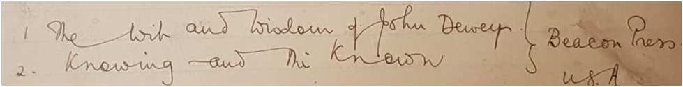 Dewey seemed genuinely interested in India’s role in the world, and the philosophical resources that grounded this importance. But time was growing short. Dewey was confronted with increasingly frail health and decreased energy for his philosophical projects. Dewey remained as active as he could, even authoring large works such as Knowing and the Known (1949) with Arthur Bentley—a work that we know that his now-aged student, Ambedkar, knew about, given the evidence of his own notetaking from the 1950s.